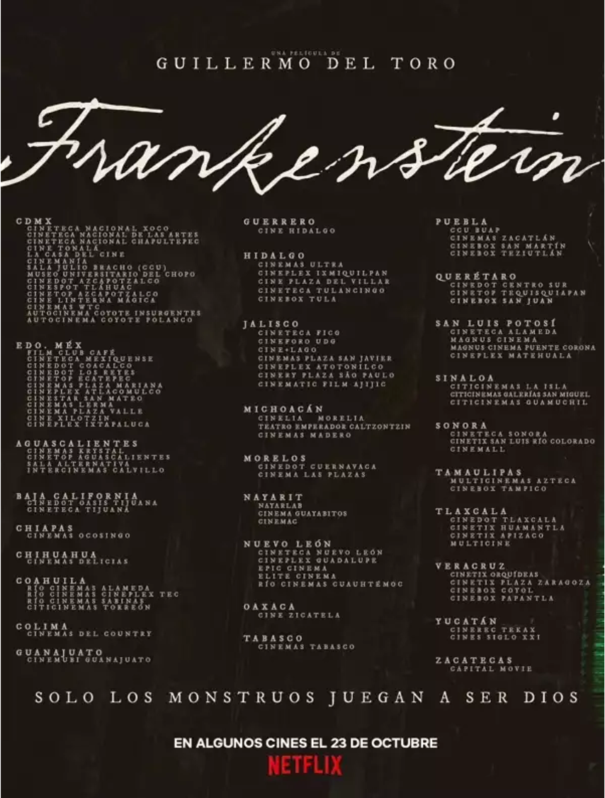 Basada en la clásica novela de Mary Shelley, la historia vuelve a la pantalla grande bajo la visión del director de El laberinto del fauno y La forma del agua. Sin embargo, al igual que ocurrió con Pinocho en 2022, la película solo podrá verse en una selección limitada de salas, muchas de ellas independientes y fuera del circuito comercial tradicional.